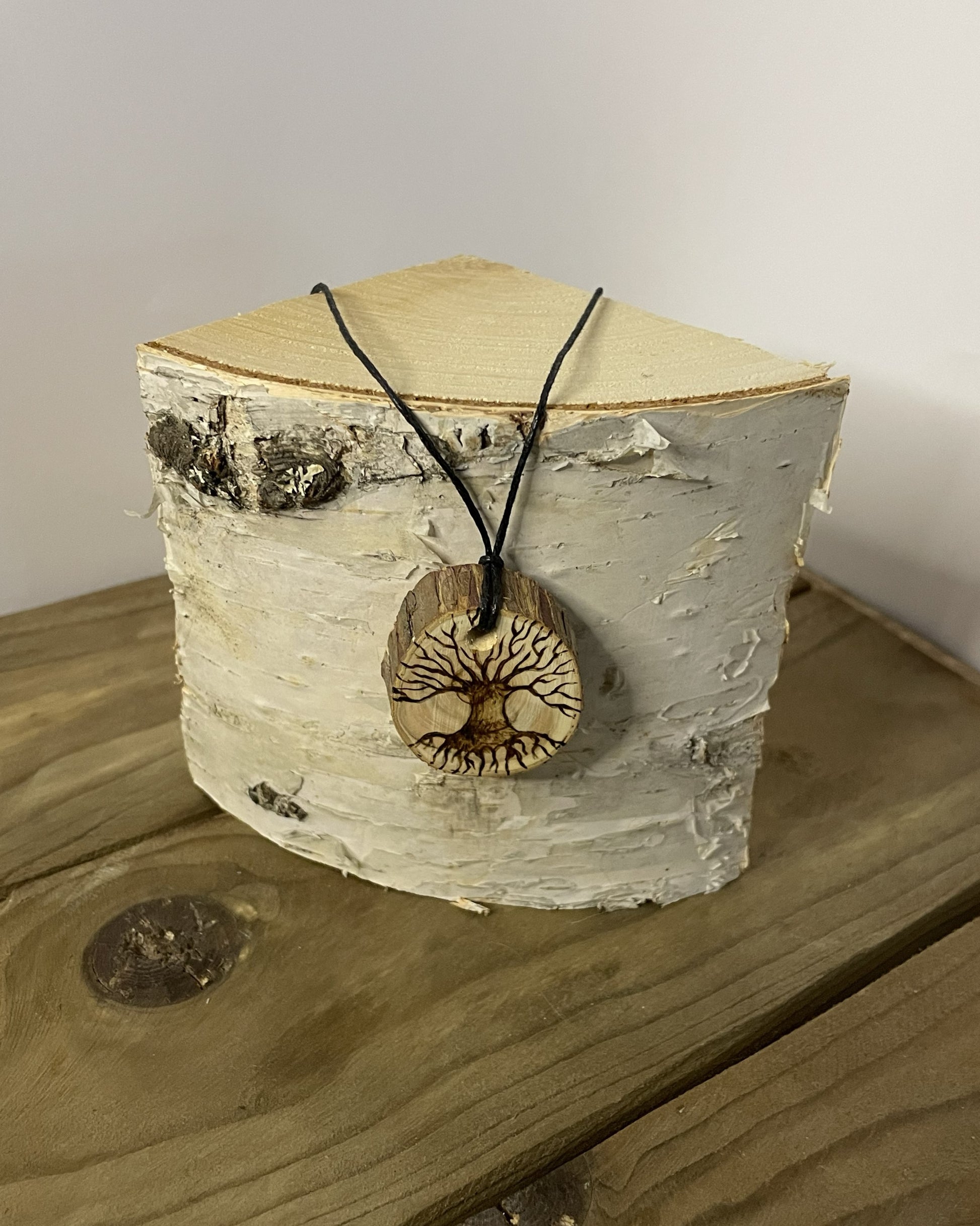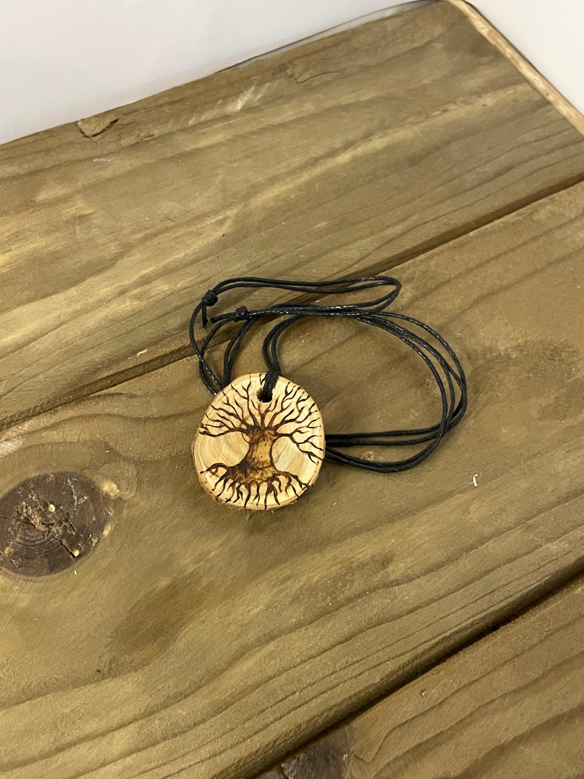 Katajainen kaulakoru, johon on polttokaiverrettu kuvio.