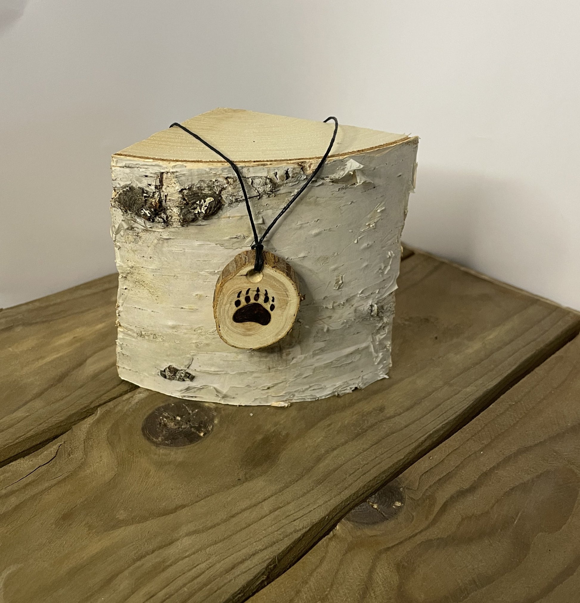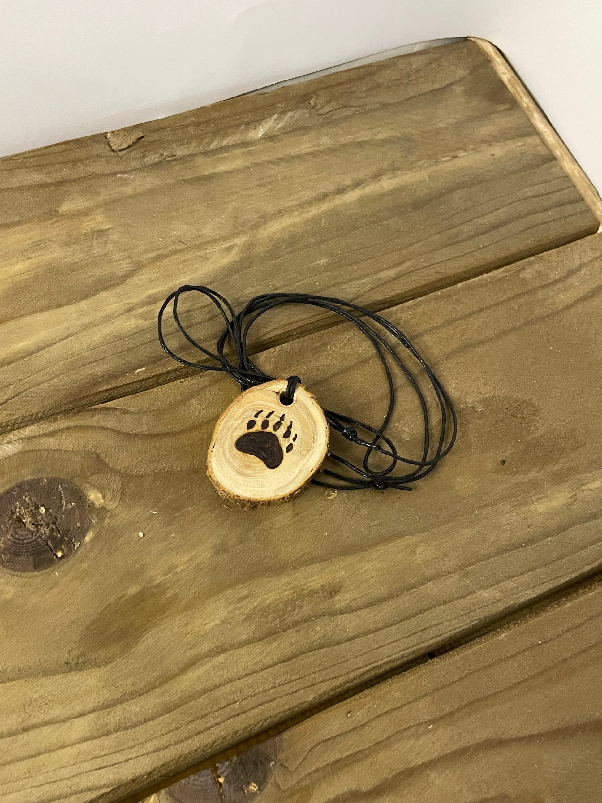 Katajainen kaulakoru, johon on polttokaiverrettu kuvio.