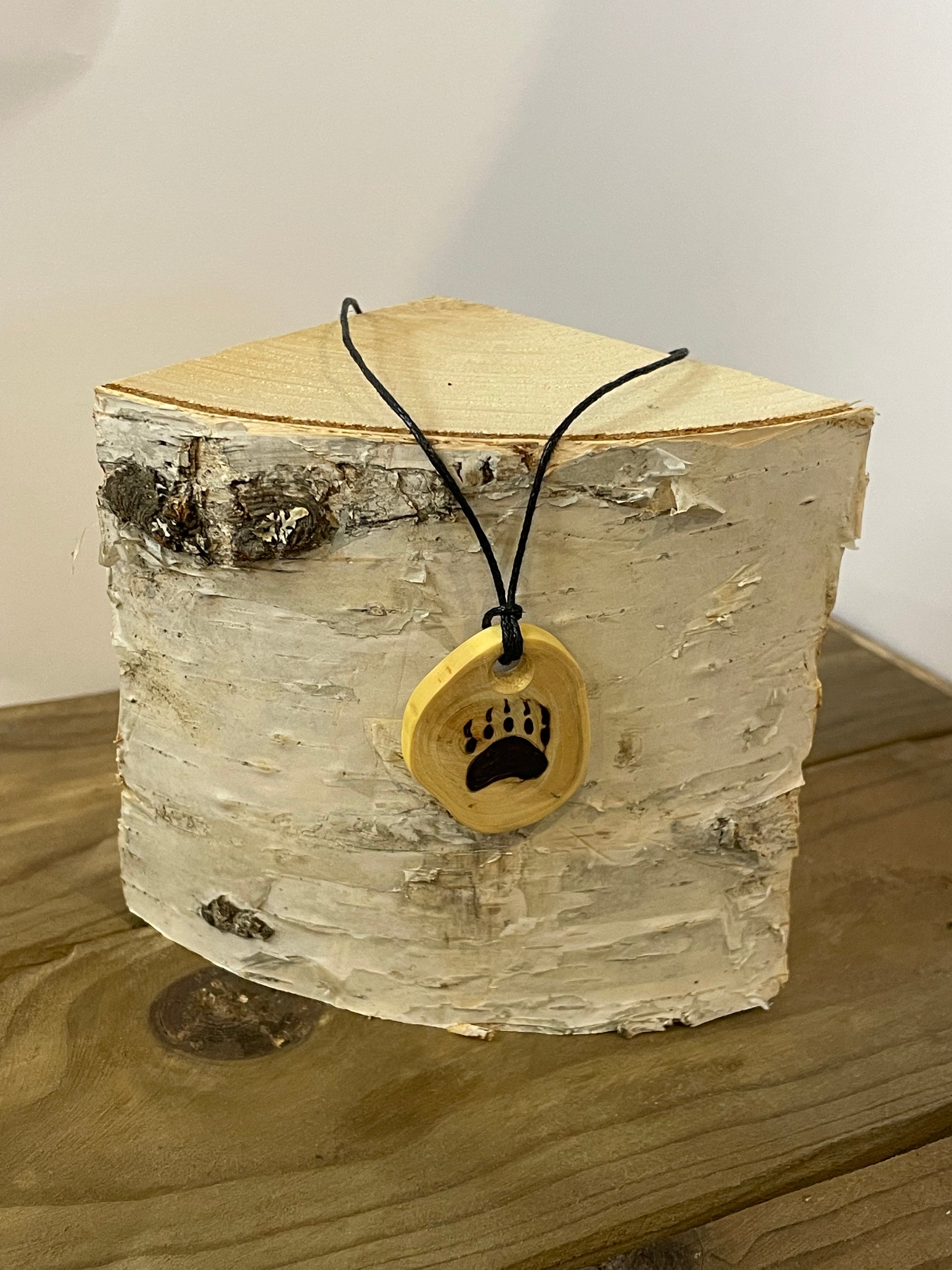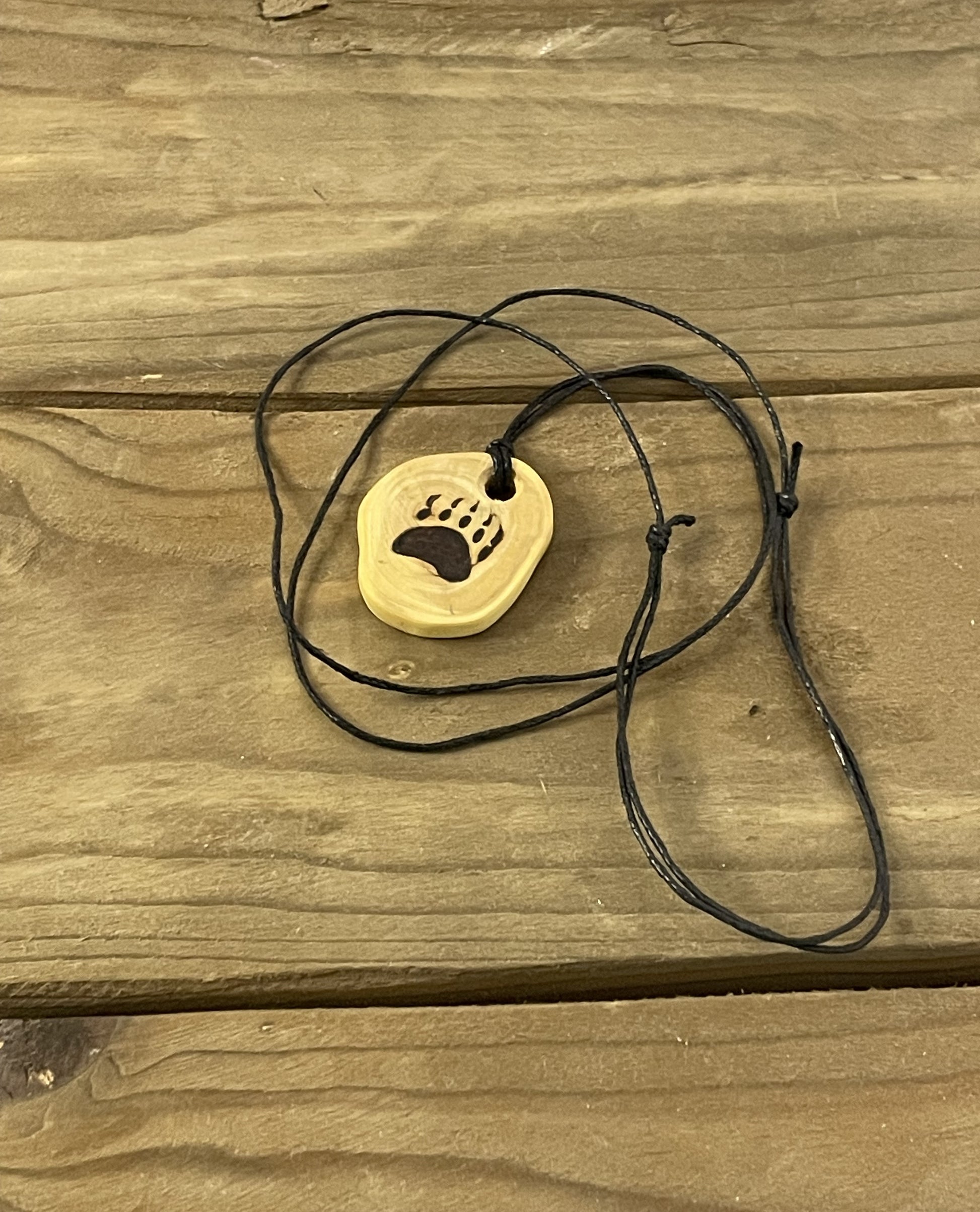 Katajainen kaulakoru, johon on polttokaiverrettu kuvio.