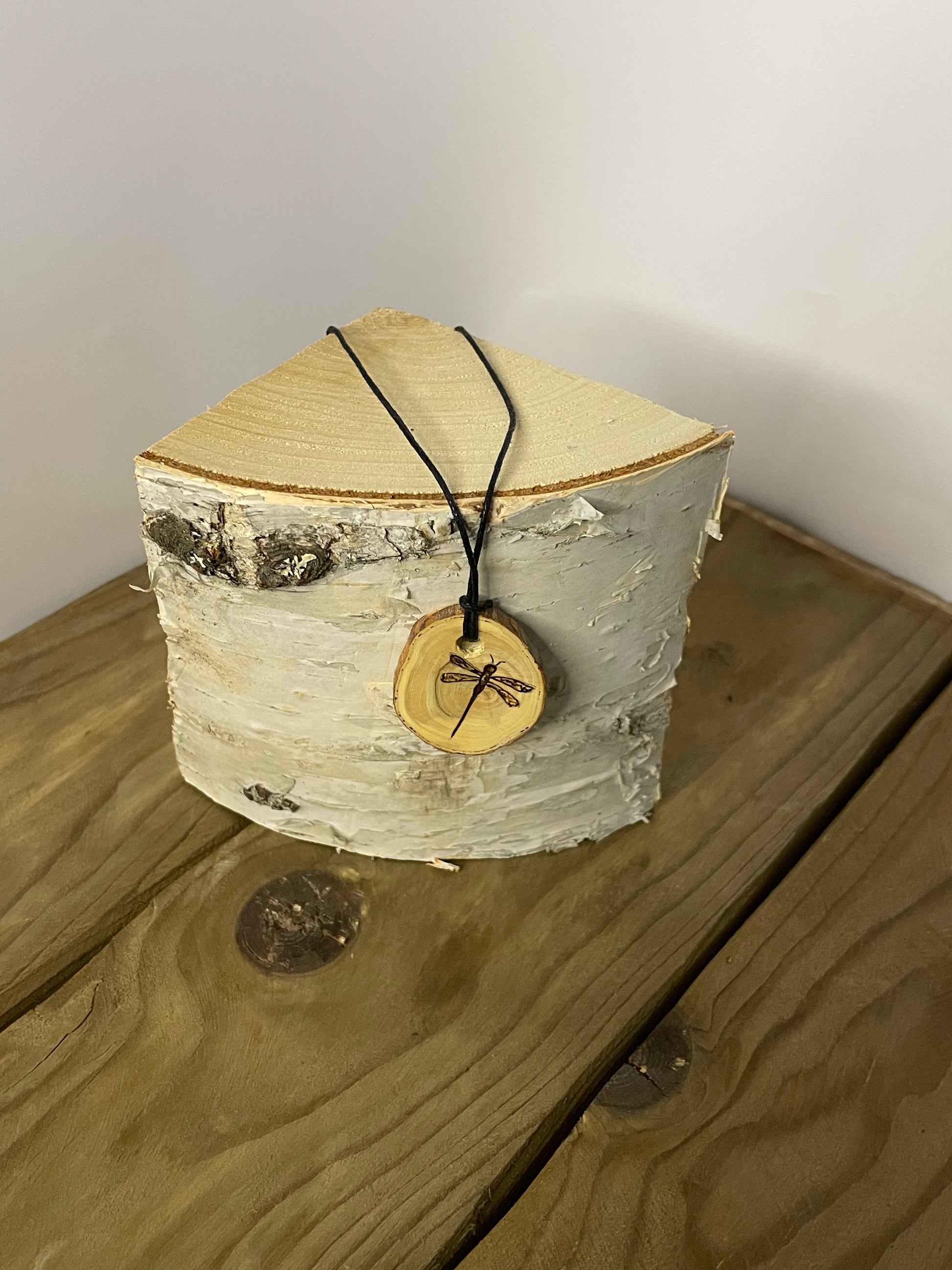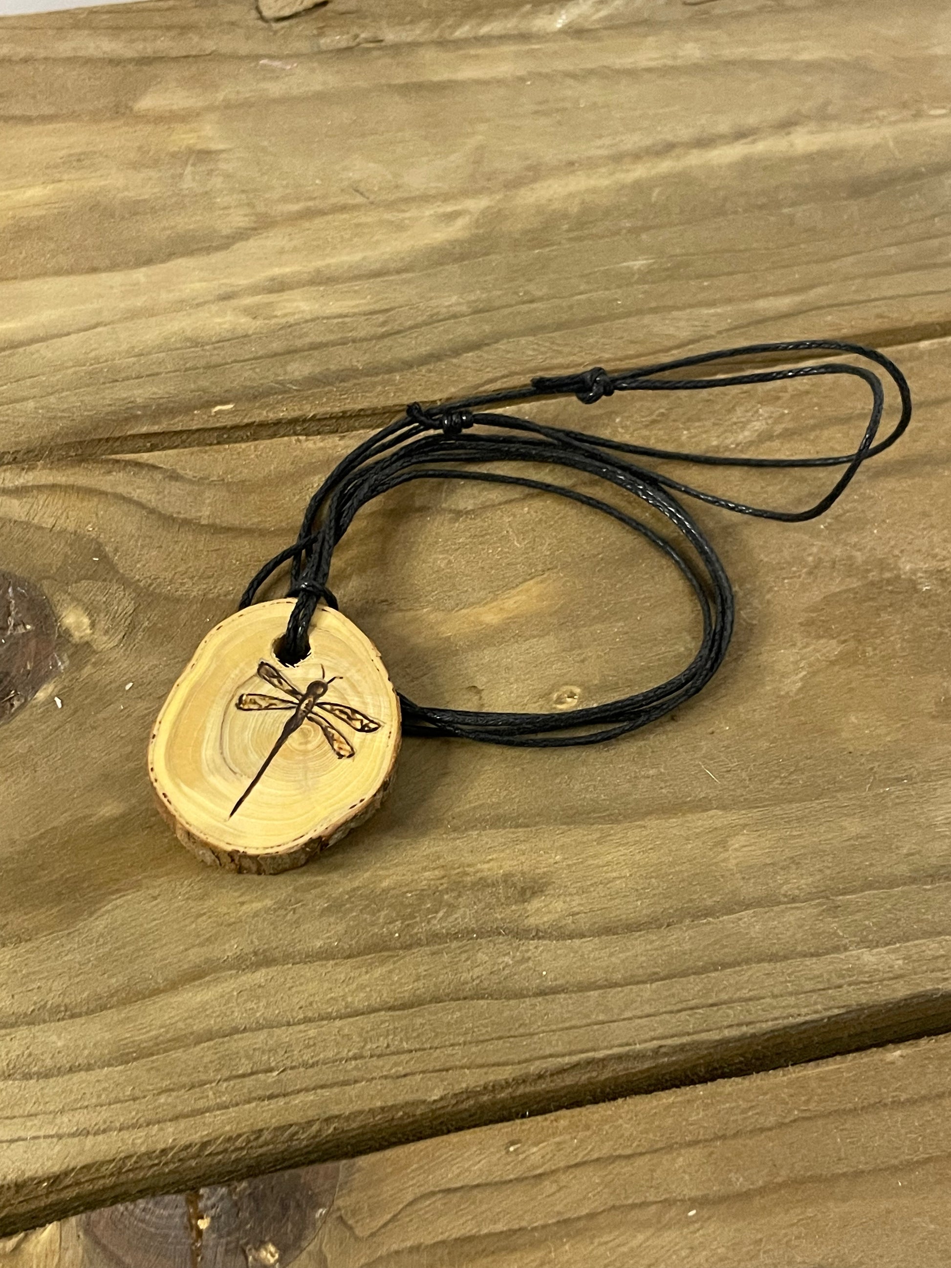 Katajainen kaulakoru, johon on polttokaiverrettu kuvio.
